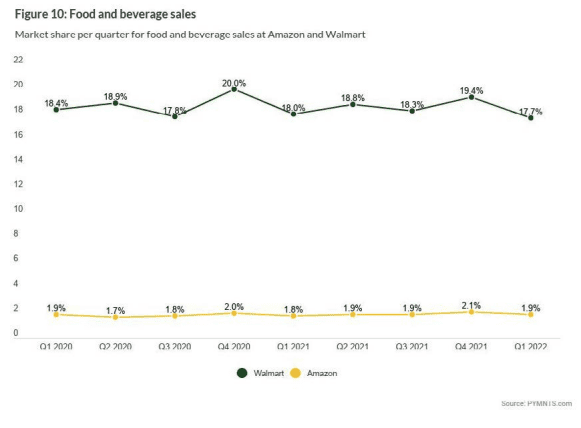 - Walmart’s 17.7% of food and beverage share trounces Amazon’s 1.9% share.