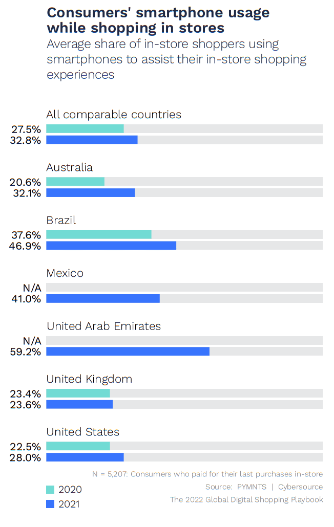 In total, 43% of Australian shoppers pulled out smartphones while on their most recent retail excursion, “whether to purchase products via an app, pay using a mobile wallet at the brick-and-mortar point of sale or otherwise. This means that an estimated one million more local shoppers used smartphones at one point during their most recent retail experiences in 2021 than in 2020 — a 47% increase.”