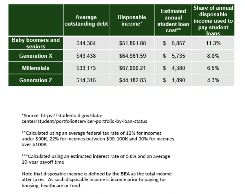 Baby Boomers and seniors average a debt of $44,000 per borrower, so more than 11% of their disposable income will now be used for student loan payments. Millennials and Generation X will lose 6.5% to 8.8% of disposable income to the same monthly obligation.