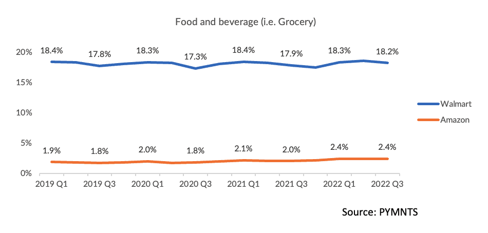 As PYMNTS has estimated, the two commerce juggernauts’ relative share in grocery spend has been stagnant, and Walmart’s roughly 18% share is multiples of Amazon’s.