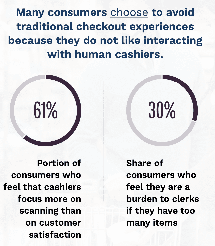 A significant share of consumers feel overlooked by cashiers in the traditional checkout experience and/or experience social pressures that they do not have to deal with in self-service checkout.