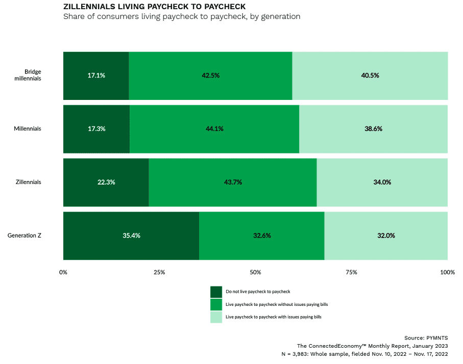 Finances: Perhaps due to their age and life stage, 76% of surveyed bridge millennials live with a partner, the highest among the younger generations. However, as noted in the PYMNTS’ January “Connected Economy™ Monthly Report,” compared to the same younger demographics, they are the age cohort most likely to be living paycheck to paycheck, both with and without issues paying bills. This may also be due to their life stage, as some presumably start a family as well as take on the burden of homeownership.