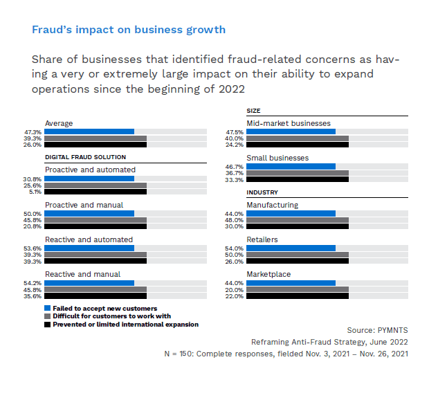 Businesses adopting proactive and automated solutions to digital fraud suffer the least impact on new customer acceptance, friction in the consumer experience and limits to their international expansion. Most at risk are organizations utilizing reactive and manual systems, where 54% of these firms missed out on new customer opportunities due to their reliance on outdated solutions.