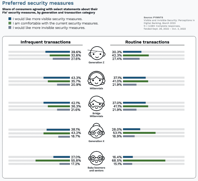 Just don’t tell the baby boomers; only 16% of the older generational cohort said they want more visible security measures for routine, everyday transactions. That number bumped up 27% for more infrequent or singular transactions.