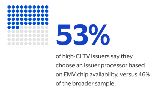 • Fraud prevention as value creation: More than half of high-CLTV issuers cite fraud prevention, tokenization and EMV chips as decisive in processor selection. For these issuers, fraud controls are not just compliance tools. They are key drivers of engagement and revenue by enabling secure, repeatable transactions.