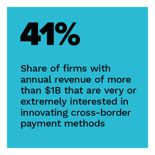 • One-quarter of firms overall are very or extremely interested in improving how they pay or manage international workers. Among all firms surveyed, 52% said they are at least somewhat interested in innovating payment methods for cross-border workers, and 24% are very or extremely interested. Among firms that annually made more than $1 billion, 41% are very or extremely interested in innovating the methods used to pay international workers, and 53% are slightly interested or somewhat interested in payment innovation.