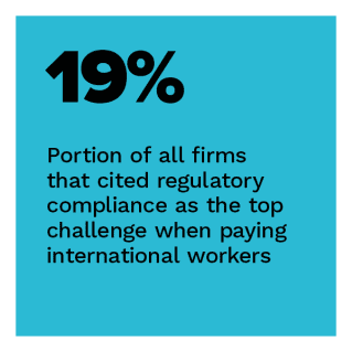 • Regulatory compliance is the top challenge firms face when paying an international workforce.