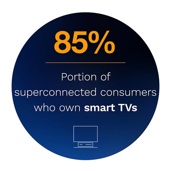 However, some device ownership traits never change. Two groups of connected consumers continue to own more devices than all the rest: superconnected consumers and bridge millennials. Superconnected consumers — those who own at least eight connected devices — are more likely than all other consumers to own most types of connected devices we examined, with