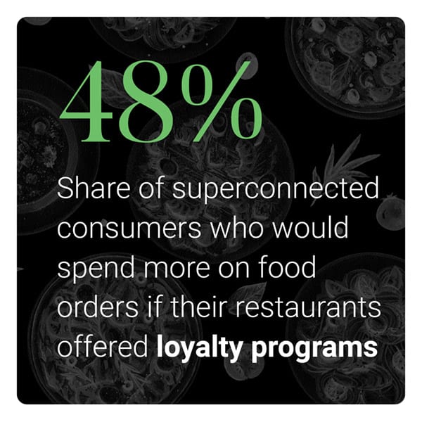 Superconnected consumers are more likely than consumers who own less than six connected devices to have shifted to ordering their food in person less and online more during the past 15 months. Twenty-seven percent say they have made this digital shift when ordering from at least one restaurant, in fact, and 87 percent of them say they plan to keep ordering food online at least somewhat as often as they do now, even after they can safely return to dining in restaurants. Restaurants will need to deliver loyalty and rewards programs that these consumers can engage with online if they hope to meet this segment’s ordering expectations going forward.