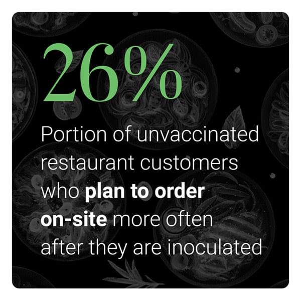 Our research shows that 26 percent of all unvaccinated restaurant customers would make more orders that require physical interactions if they were vaccinated, underscoring a potential boon for restaurants in the coming months. This opportunity is especially acute for independent quick-service restaurants (QSRs), 29 percent of whose unvaccinated customers say they would order in person more often if they were immunized.