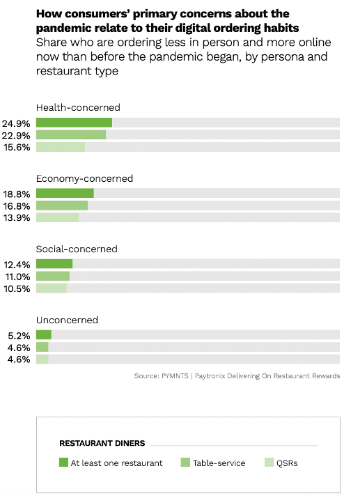 As the restaurant industry begins to recover, many people, vaccinated and otherwise, are still dealing with concerns related to the pandemic — and those concerns are shaping their ordering behaviors. As PYMNTS’ research published in the May edition of Delivering on Restaurant Rewards created in collaboration with Paytronix has identified, there are four main personas of today’s restaurant customer: the health-concerned customer, the economy-concerned customer, the social-concerned customer and the unconcerned customer. As one might expect, the digital ordering habits of the health-concerned look very different than, say, those of the social-concerned.