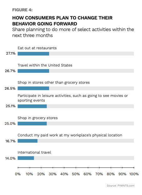 Most consumers are steering clear of restaurants. Research from The Post-Pandemic Consumer at 18 Months: Spending Now, Worrying Later, in which PYMNTS surveyed nearly 2,500 U.S. consumers about the pandemic’s effect on their behavior, found that only 27% plan to eat out at restaurants within the next three months.