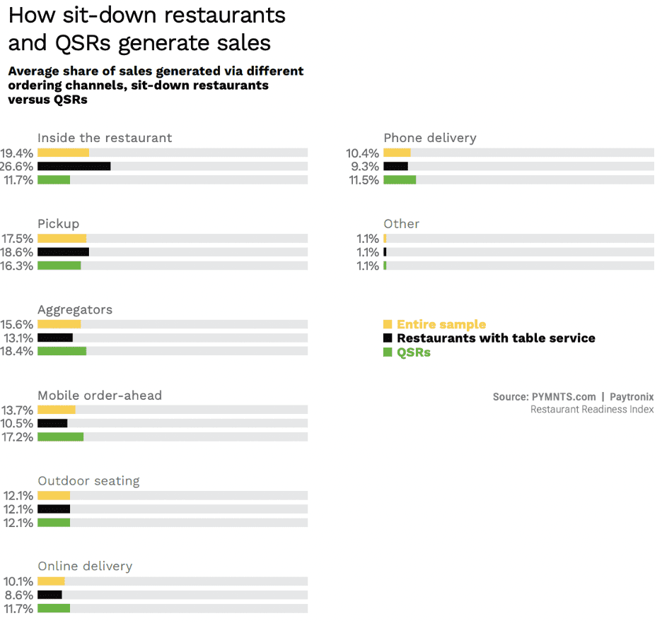 This aversion to dine-in may, however, be offset by the rise of off-premises ordering. The Restaurant Readiness Index found that about two-thirds of all restaurants’ sales are being generated through off-premises channels. Unsurprisingly, this shift to off-premises is more pronounced for quick-service restaurants (QSRs) than for sit-down establishments, with the former generating three-quarters of all sales through these channels and the latter only around three-fifths of sales.