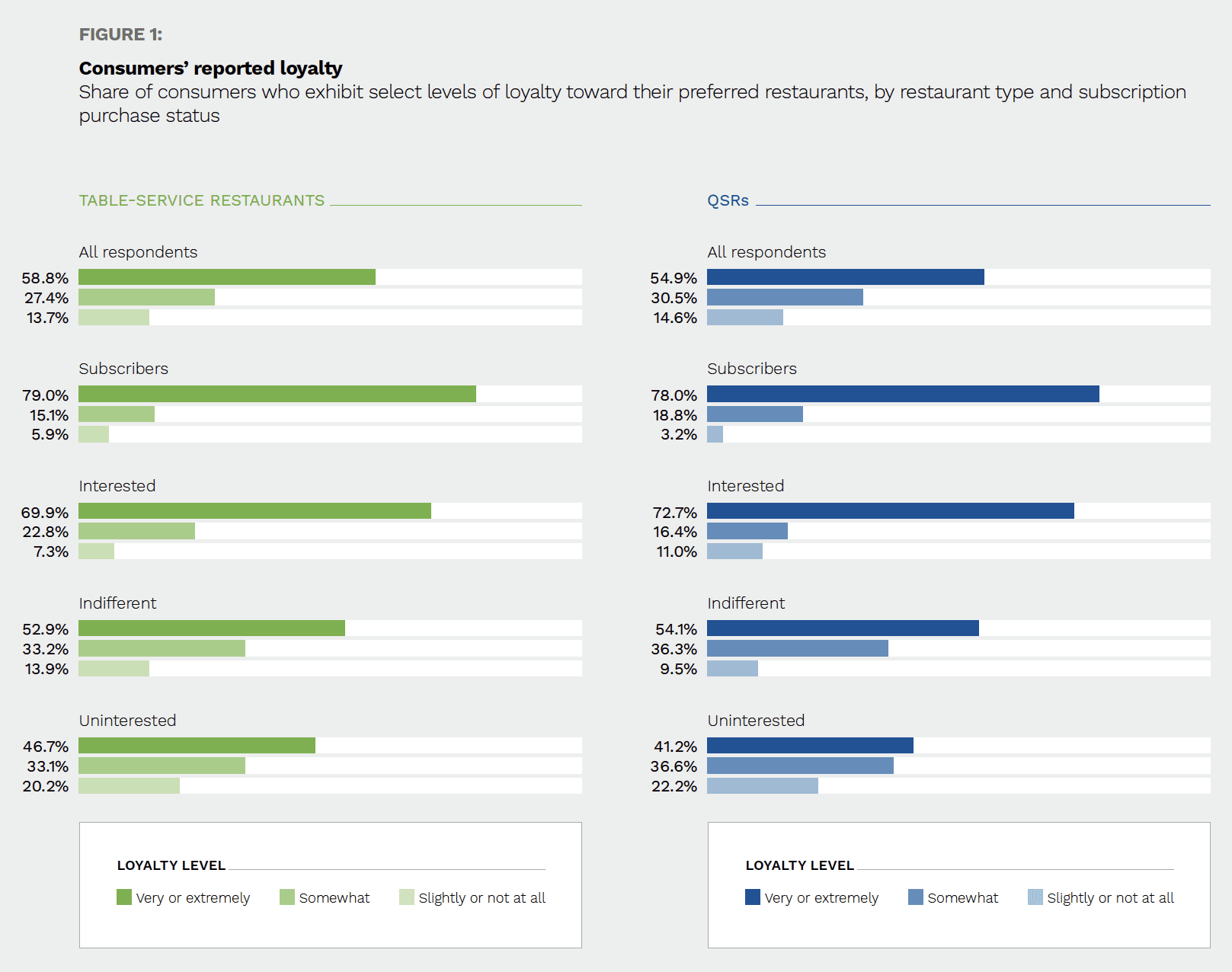 A consumer survey by PYMNTS confirms that restaurants are missing the mark on loyalty programs. Just 44% of respondents said they belong to a loyalty program for at least one table-service restaurant, while only 38% take part in at least one QSR loyalty program. These figures are substantially lower than the shares of those surveyed who identify themselves as having “very” or “extremely” high loyalty levels toward their favorite eateries, comprising 59% for table-service restaurants and 55% for QSRs. The data also shows that consumers who have signed up for a restaurant subscription plan for repeat purchases tend to feel the most loyal, followed by those who are interested in a subscription.