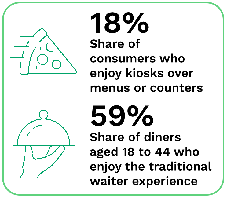 Only 17% and 18% of diners, for example, enjoy using QR codes and kiosks, respectively, instead of menus and counters. While younger consumers are the most interested in these digital tools, nearly 60% still enjoy the traditional experience of interacting with a waiter. The takeaway for restaurants is that there is no longer a single dining experience, and the best course of action is to have a smorgasbord of both digital and traditional options available, from which consumers may take their pick.