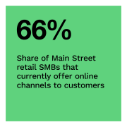 Nearly 8 in 10 Main Street SMBs use online channels, while an additional 16% are interested in implementing them. Moreover, the average Main Street SMB generates half its sales via online channels. Main Street retail SMBs lead the way, generating 54% of their sales from these channels.