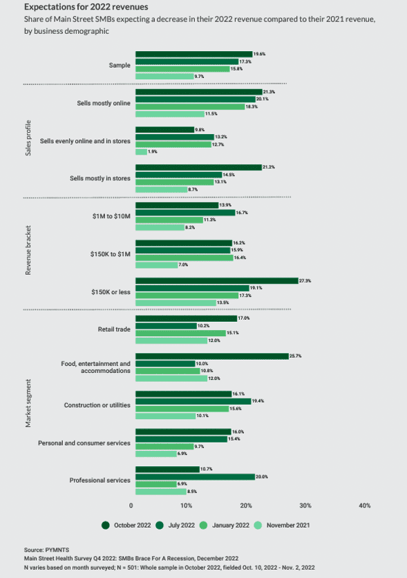 This is especially tough news for small chain and independent grocers, which have already been bracing for decreasing revenues. The PYMNTS report “Main Street Health Q4 2022: SMBs Brace for a Recession” noted that small- to medium-sized business (SMB) revenue expectations severely worsened in October for sectors involving food and retail. The share of food, entertainment and accommodations Main Street SMBs projecting decreased revenues for the entire year rose two and a half times to 26% from July.
