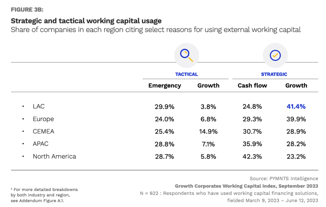 Conversely, corporate growth businesses in the LAC region used working capital to cover emergencies more intensively than any other, at 30%, meaning using these assets to cover unplanned shortfalls and urgent situations that led to cash flow shortages.