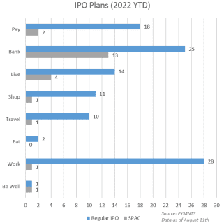 To get a sense of just how anemic SPAC activity has been in the payments space, consider the chart. As tracked by PYMNTS, the IPO “plans” by segment — that is, the announcements of SPACs formed to find targets within financial services and related technologies — has dripped and drabbed to a listing here, a listing there (and none in the “Eat” segment).