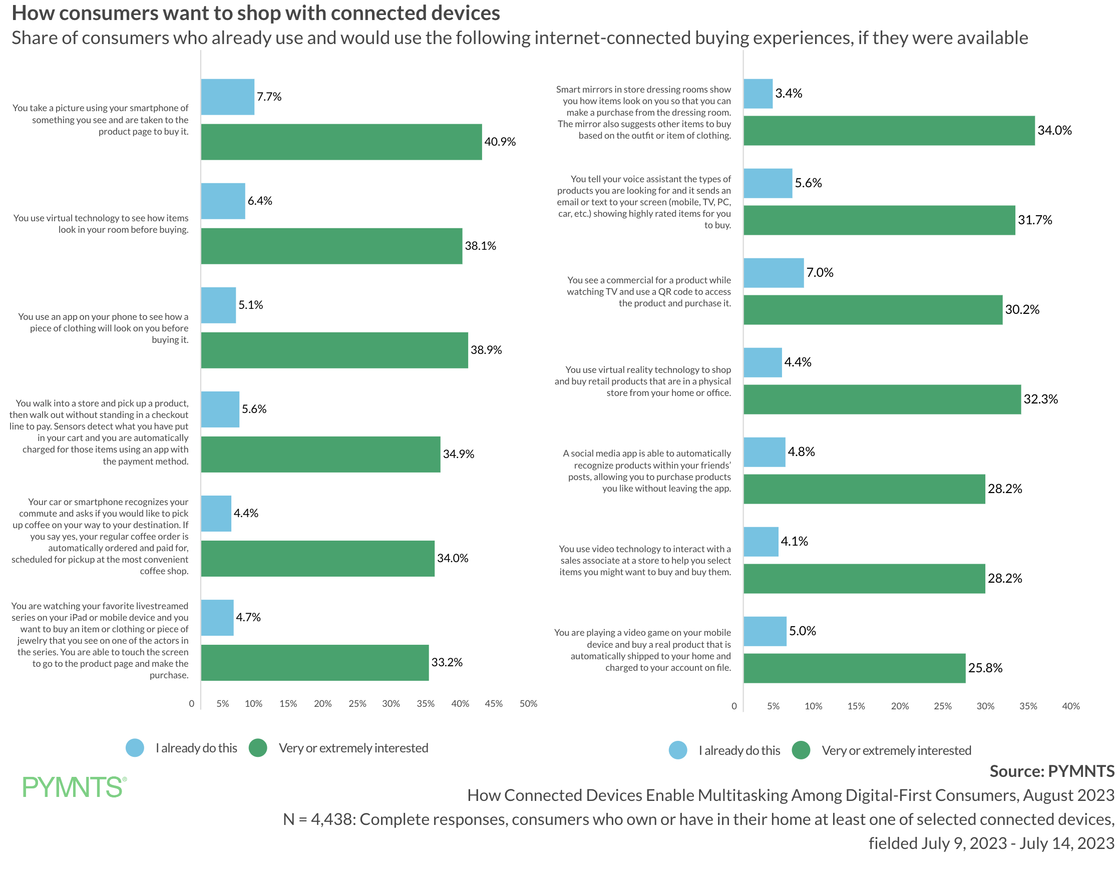 According to PYMNTS Intelligence’s “How We Will Pay Report: How Connected Devices Enable Multitasking Among Digital-First Consumers,” which drew from a survey of more than 4,600 U.S. consumers, many connected device users are interested in shopping opportunities as they stream content.