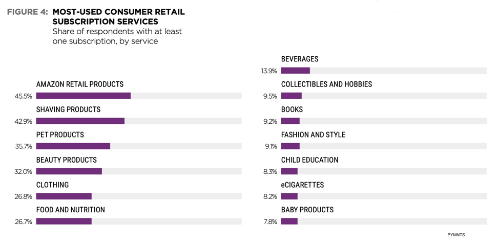 Amazon is the one to beat for online retailing — and this also holds true for subscription commerce. More consumers turn to Amazon for retail product subscriptions than any other type of subscription product service, with 45.5 percent of survey respondents indicating they do so. This share is larger than the combined portion of consumers who subscribe to any single other product category, including the 42.9 percent of shaving products subscribers, the 35.7 percent who subscribe to pet products and the 32 percent who do so for beauty products.