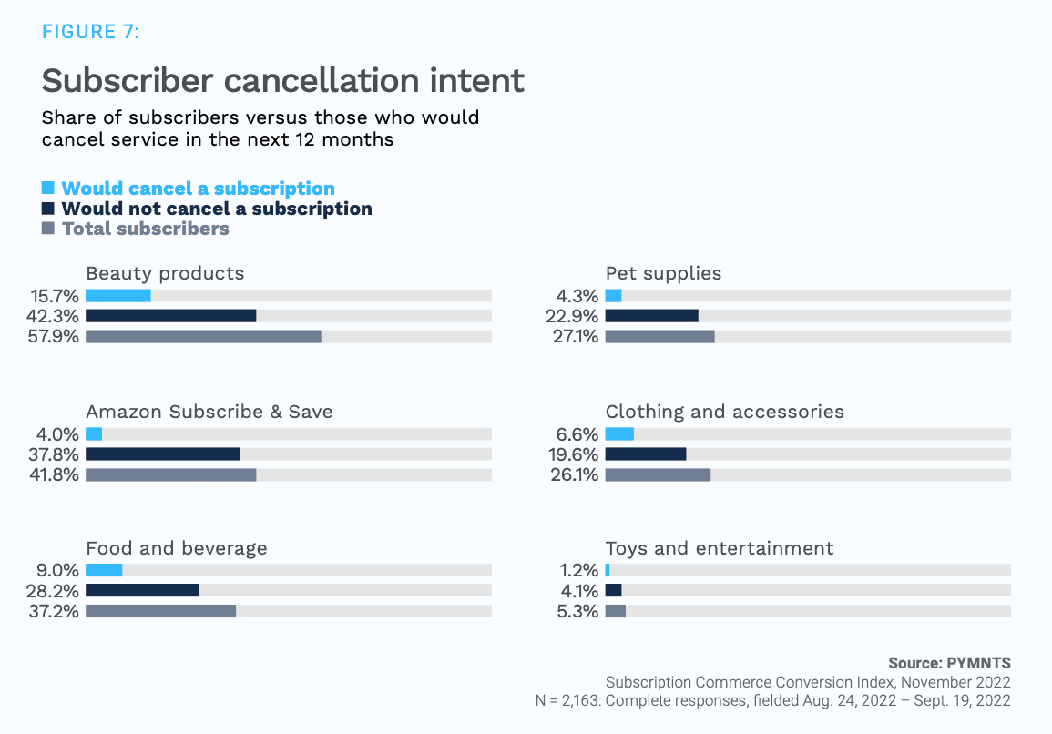 Considering cancellation intent data findings from the new Subscription Commerce Conversion Index, this double-down on streaming may be seen as a safe harbor in troubled waters. Our data found that only 1.2% of those surveyed intend to cancel entertainment subscriptions, compared to 16% for beauty products, and even 4% for popular Amazon Subscribe and Save.