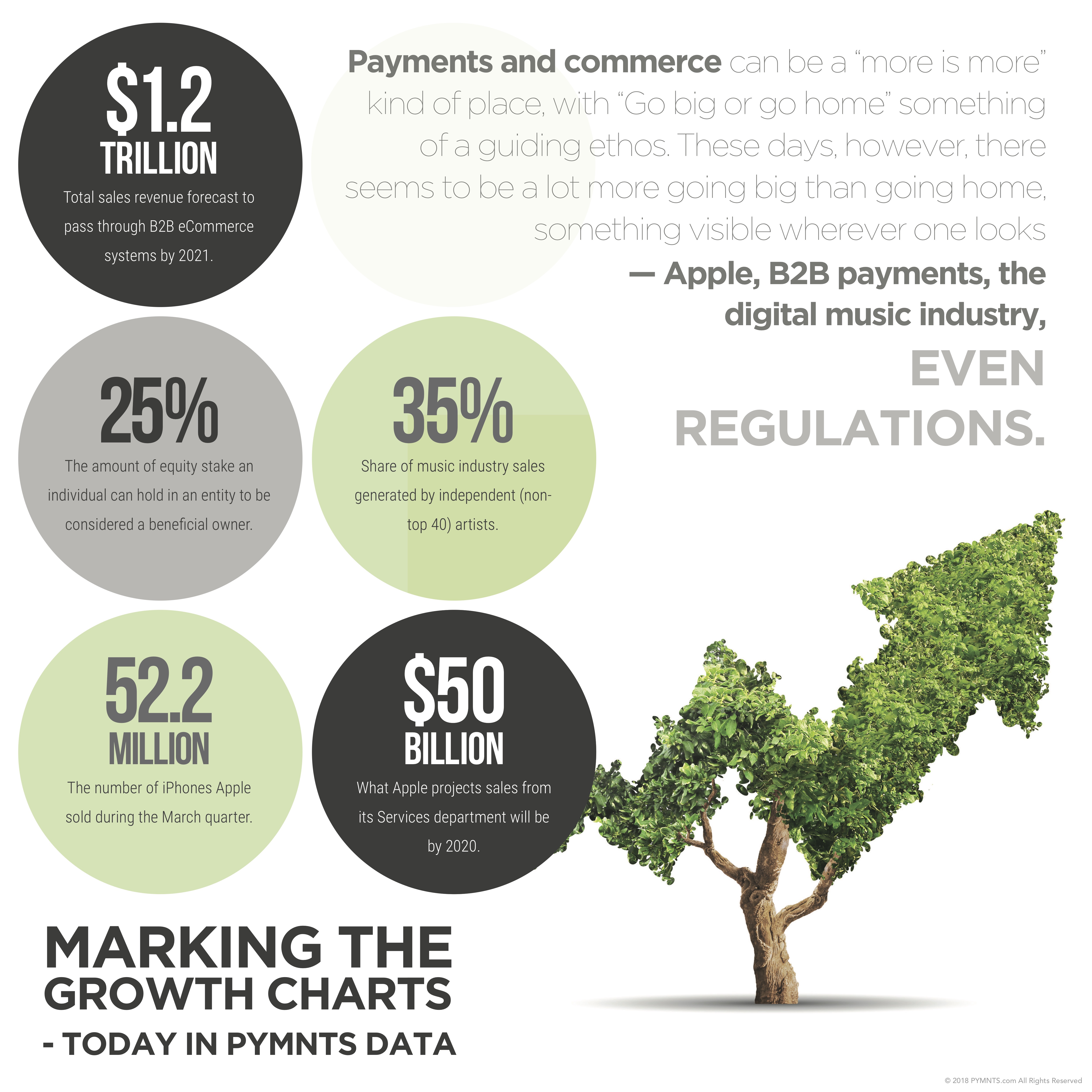 Spring is here, and growth spurts are the rule of the day. Apple managed to notch bigger sales and revenue growth last quarter and has some great expectations for growth in its Services department. Regulatory footprints are also expanding — hopefully in such a way that will mean money laundering is shrinking. B2B eCommerce systems will soon be worth over a trillion dollars. Even the music industry is growing for independent artists who can now be paid in real time.