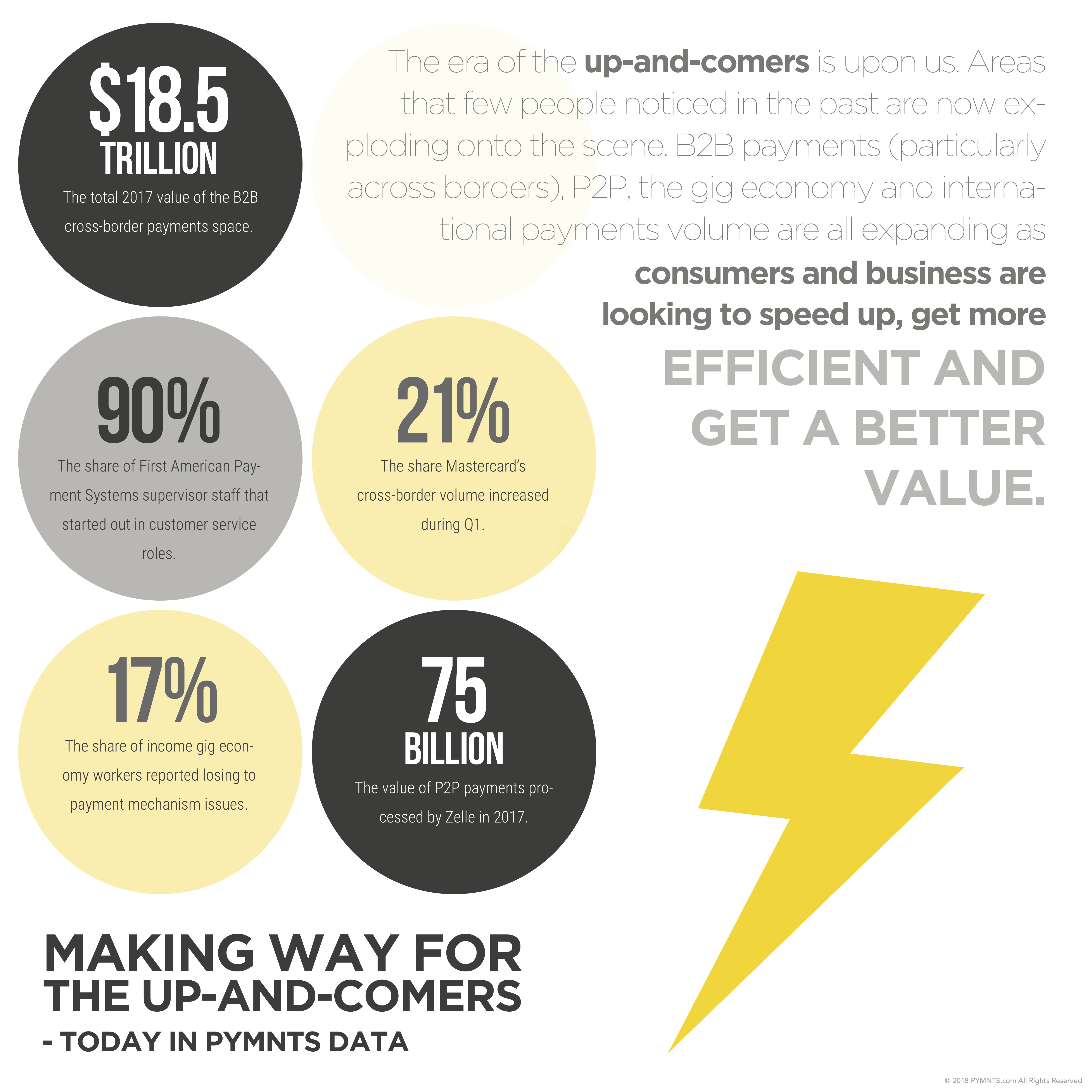 The era of the up-and-comers is upon us. Areas that few people noticed in the past are now exploding onto the scene. B2B payments (particularly across borders), P2P, the gig economy and international payments volume are all expanding as consumers and businesses are looking to speed up, get more efficient and get a better value.