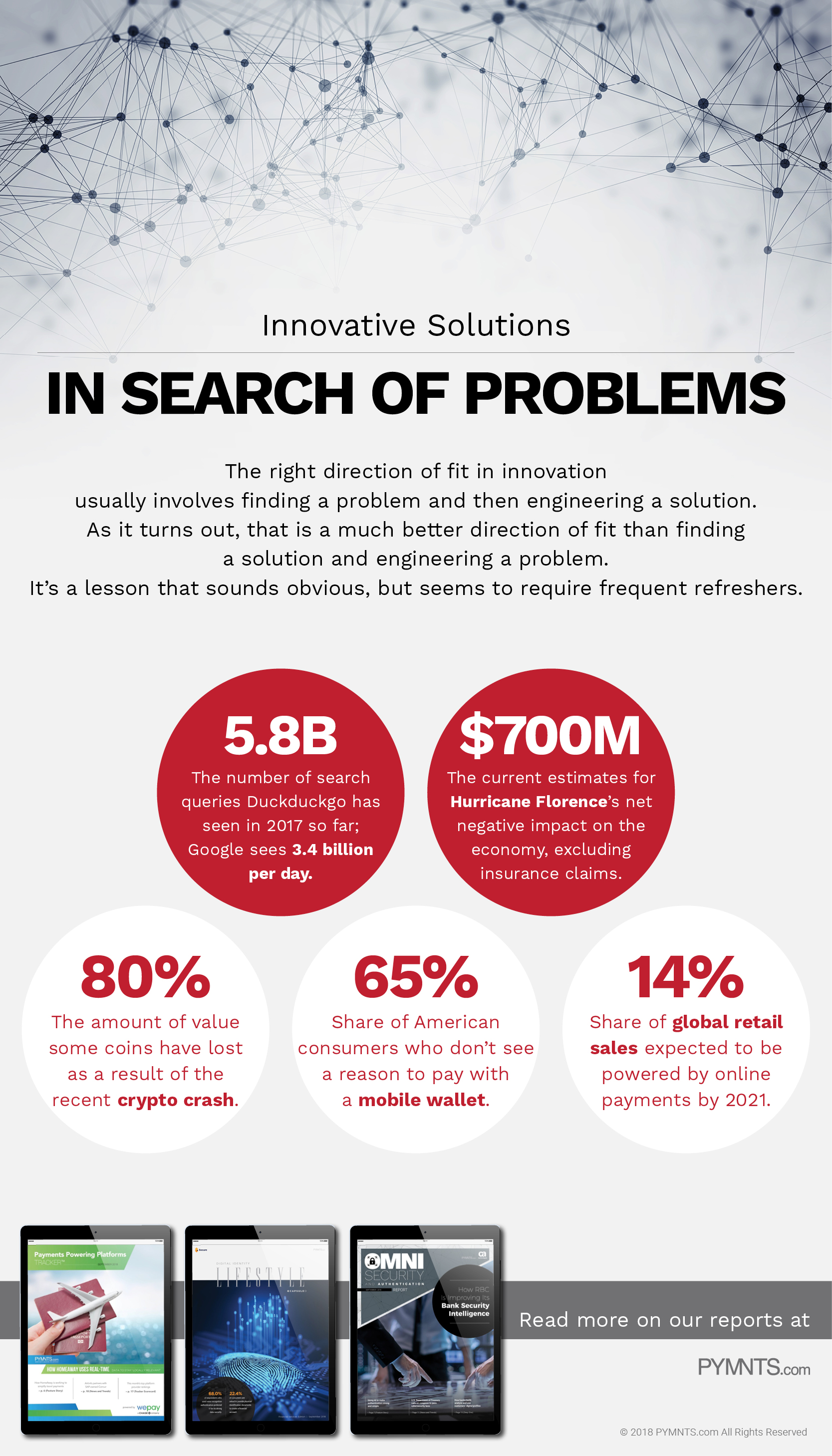 Sometimes a problem that needs to be solved is pretty obvious: A hurricane is bearing down on the coast, and there are solutions needed to minimize the damage. But sometimes, innovators get the process backwards, and find they have a great solution, but not a problem to go with it. It’s a situation cryptocurrency has faced recently, as investors have suddenly woken up to wondering what exactly blockchain currencies are really good for. Mobile wallets continue to struggle in the U.S. as consumers struggle to find a reason to use them, as online and omnichannel purchases are growing worldwide. Consumers don’t always just need solutions, even in high-interest areas like privacy, security and flexibility – sometimes they also need a clearer picture of the problem they are solving.