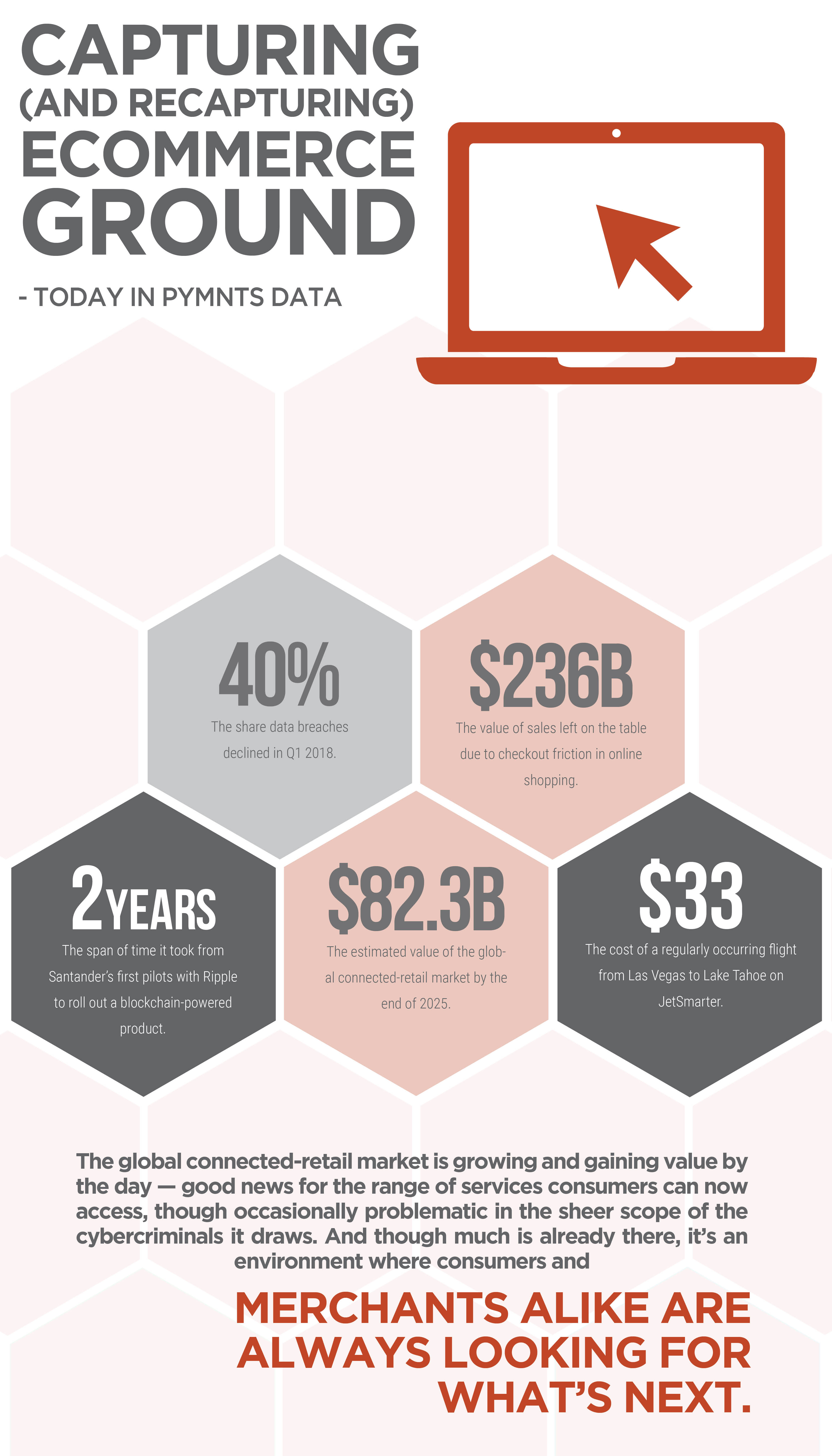 The world is a rapidly changing place, thanks to the power of connected commerce. Don’t like flying commercial? JetSmarter can put you on a private plane that is occasionally the cheaper way to fly. Ready for blockchain to be a bigger part of your life for some reason? Ripple and Santander have your back. Want better checkout options? PayPal is thinking about you. Of course, with more opportunites come more freeloaders looking to ride in the digital economy through cybercrime. Though the overall breach rate fell in early 2018, all in 1.4 billion consumers have seen at least some of their data exposed. Good and bad, the progress rolls on, and the values in the connected-commerce marketplace keep ticking up.