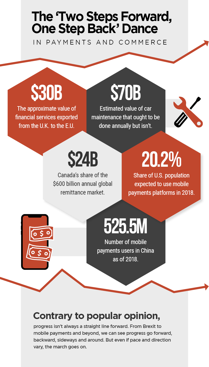 While progress is always ongoing in payments and commerce, its path isn’t always straightforward or even. In China, mobile payments adoption has been racing forward, and stateside its progress is notably slower. Brexit negotiations go forward, backward and sideways, such that the eventual endpoint remains hard to forecast. And yet, as technology improves and data is more easily collected and interpreted, progress marches on in payments and commerce as new channels for funds to flow worldwide keep on opening.
