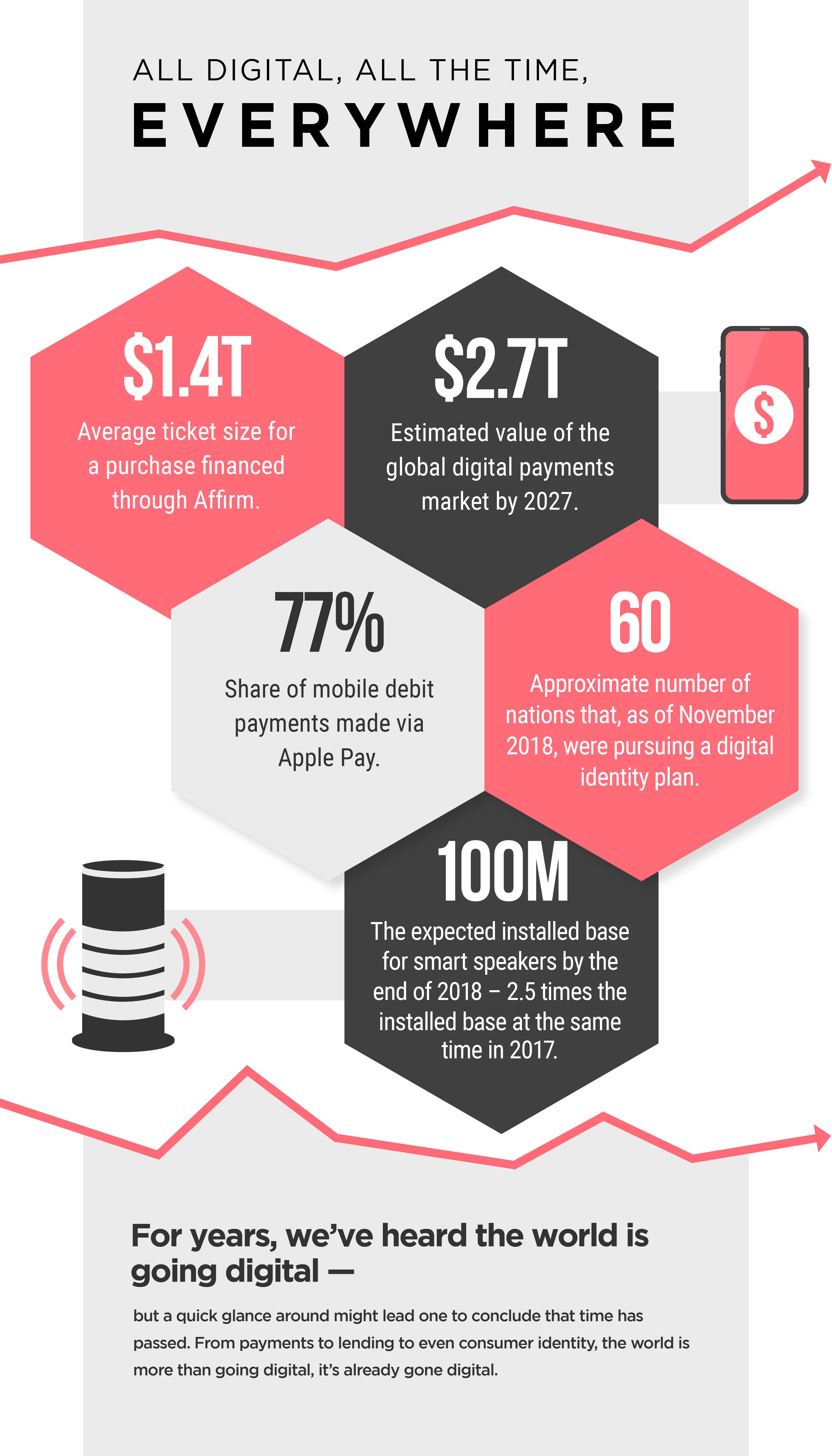 The fact that things are going digital isn’t shocking or even news – it has seemingly been the drift of things for over two decades. But the speed at which some things have already made the switchover – payments and lending spring to mind – is impressive. And the speed with which relatively new ideas in digitization – speakers and identity, for example – have come from out of nowhere to dominate conversations in only the last few years. The world, it seems, isn’t going digital, it’s already mostly gone digital – leaving consumers and businesses to catch up.
