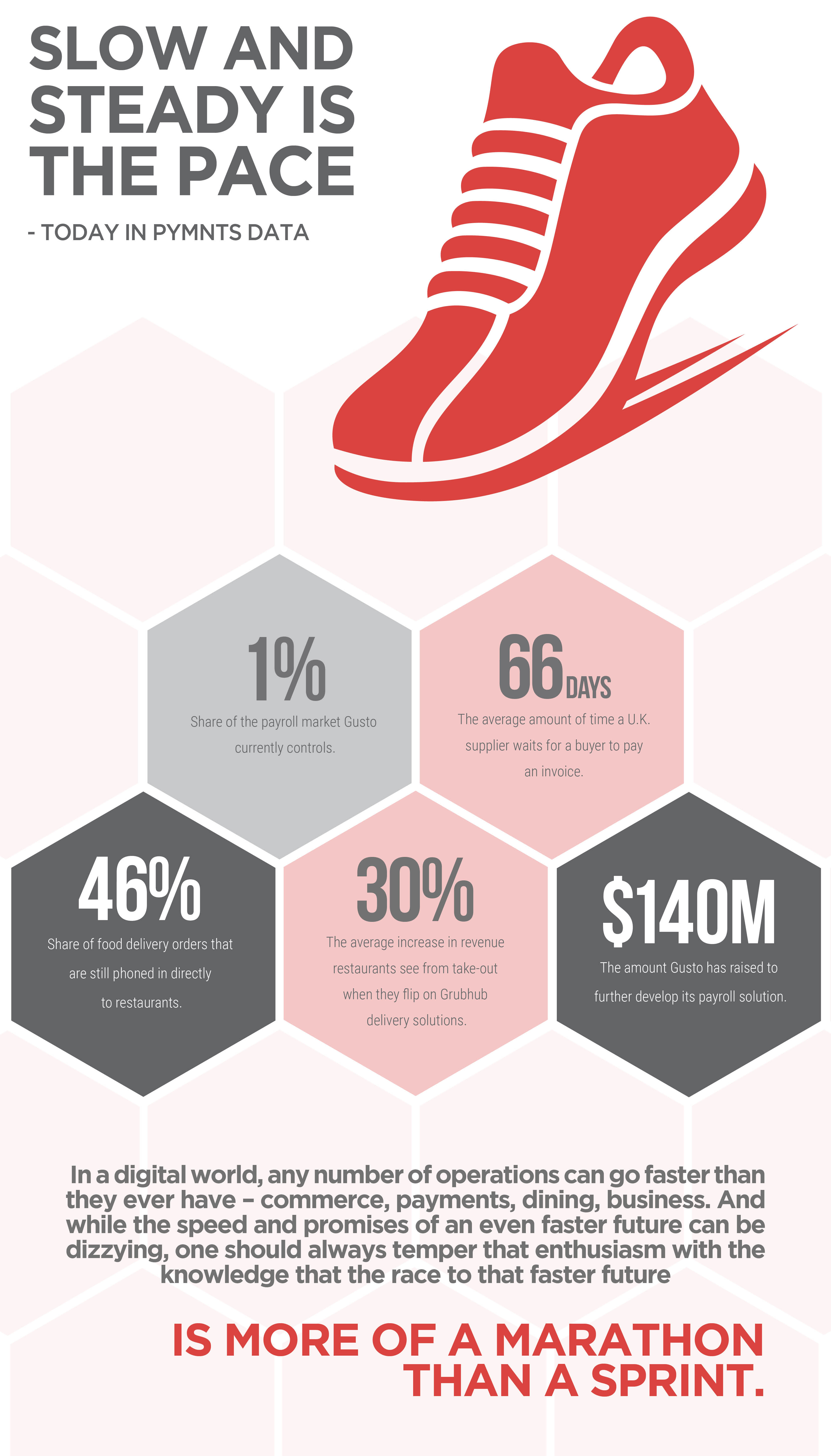 The preferred speed setting for everything in the era of cloud connectivity, mobile and digitization is “faster.” Suppliers want buyers to pay their invoices faster, employees want to be paid faster – even people waiting for their take-out order want their delivery guy to go faster. But while the demand (and need) for speed is apparent and growing, the pace of actually getting everyone into position to race is a bit more time-consuming than one might imagine. Just because the technology is ready to rev up the speed of transactions doesn’t necessarily mean all the players in the market are quite prepared, as of yet, to fully pick up their pace.