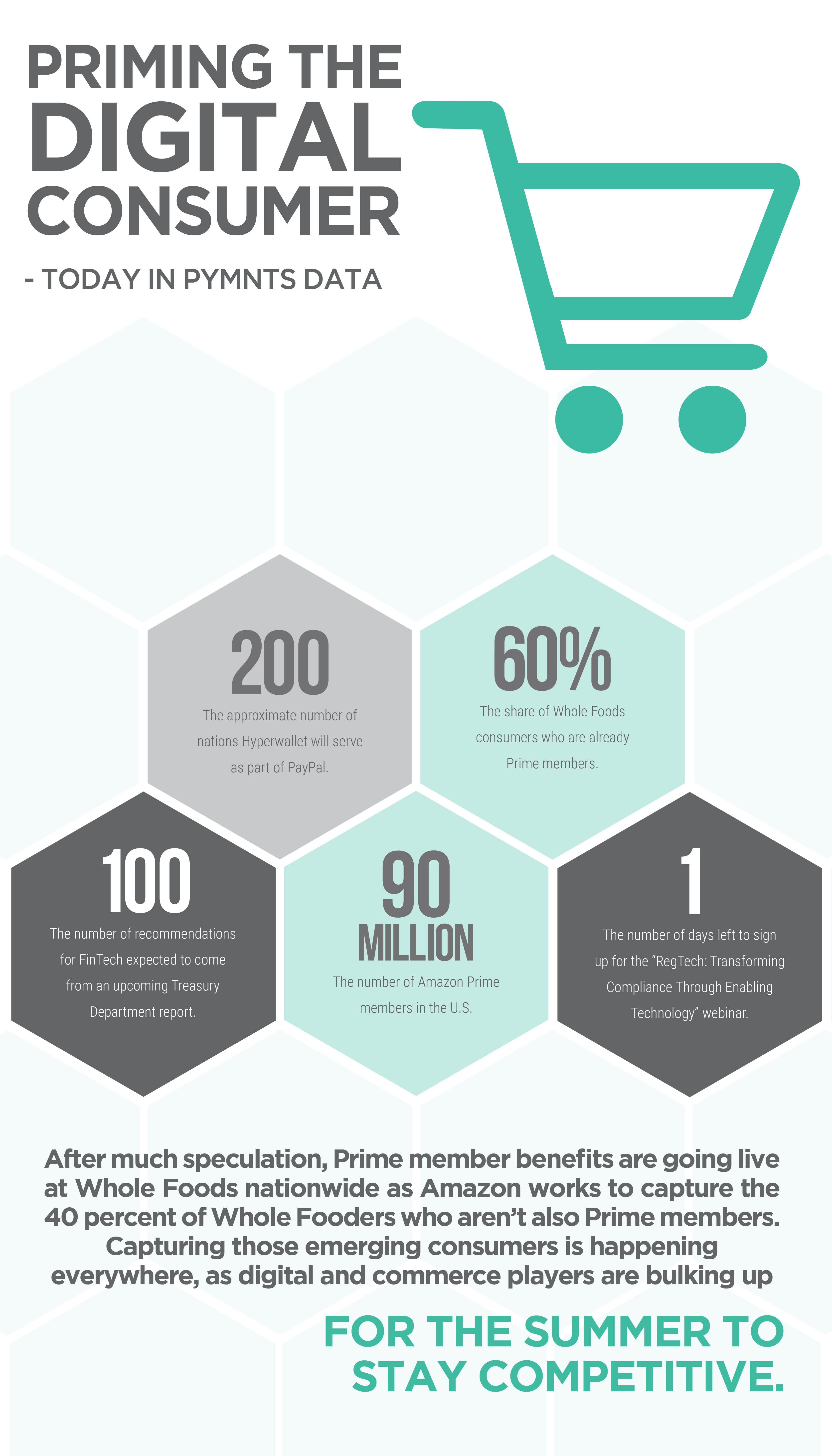 Starting this week, Whole Foods Market shoppers who are also Amazon Prime members will see their benefits rolling in no matter where they are, as the program goes nationwide. The grocery games — and who will win the new multichannel grocery shopper — are the main events this summer, but the competition is heating up all over the map. Also, PayPal’s been securing some big buys. Its new pair-up with Hyperwallet will help power push payments wherever, whenever. It’s an opportunity-rich environment, though one that’s also full of challenges, particularly of the regulatory kind. That’s because, when it comes to moving money, it can’t just be fast and easy — it must also be compliant.