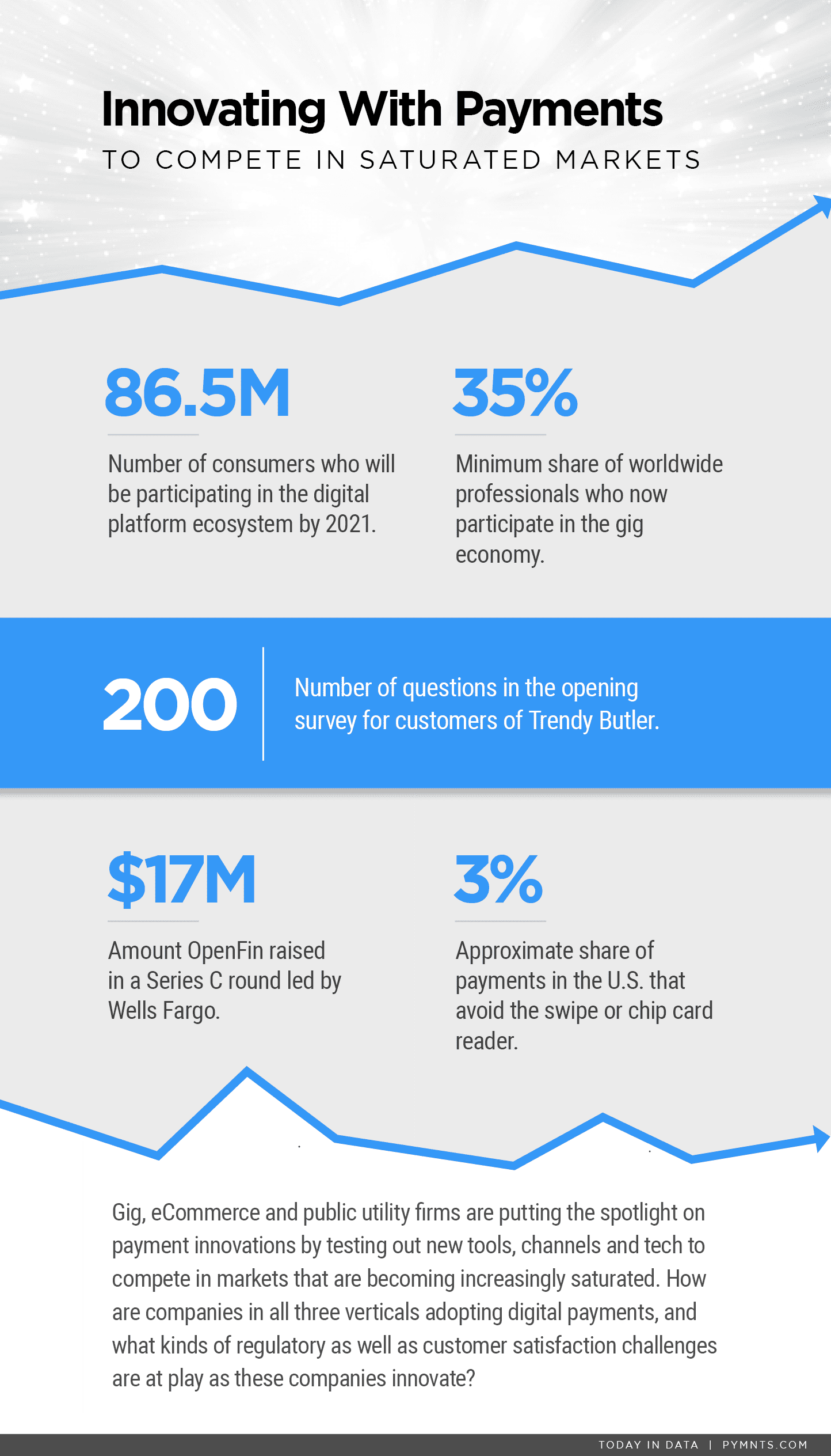 Gig, eCommerce and public utility firms are putting the spotlight on payment innovations to remain competitive in markets that are becoming increasingly saturated. In contactless payments news, only a small fraction of payments in the United States avoid the swipe or chip card reader. And financial operating system company OpenFin recently raised funds in a Series C round. In retail, subscription box service Trendy Butler is looking to serve men who want to dress better, and a staggering number of consumers will soon be participating in the digital platform ecosystem. All this, Today In Data.