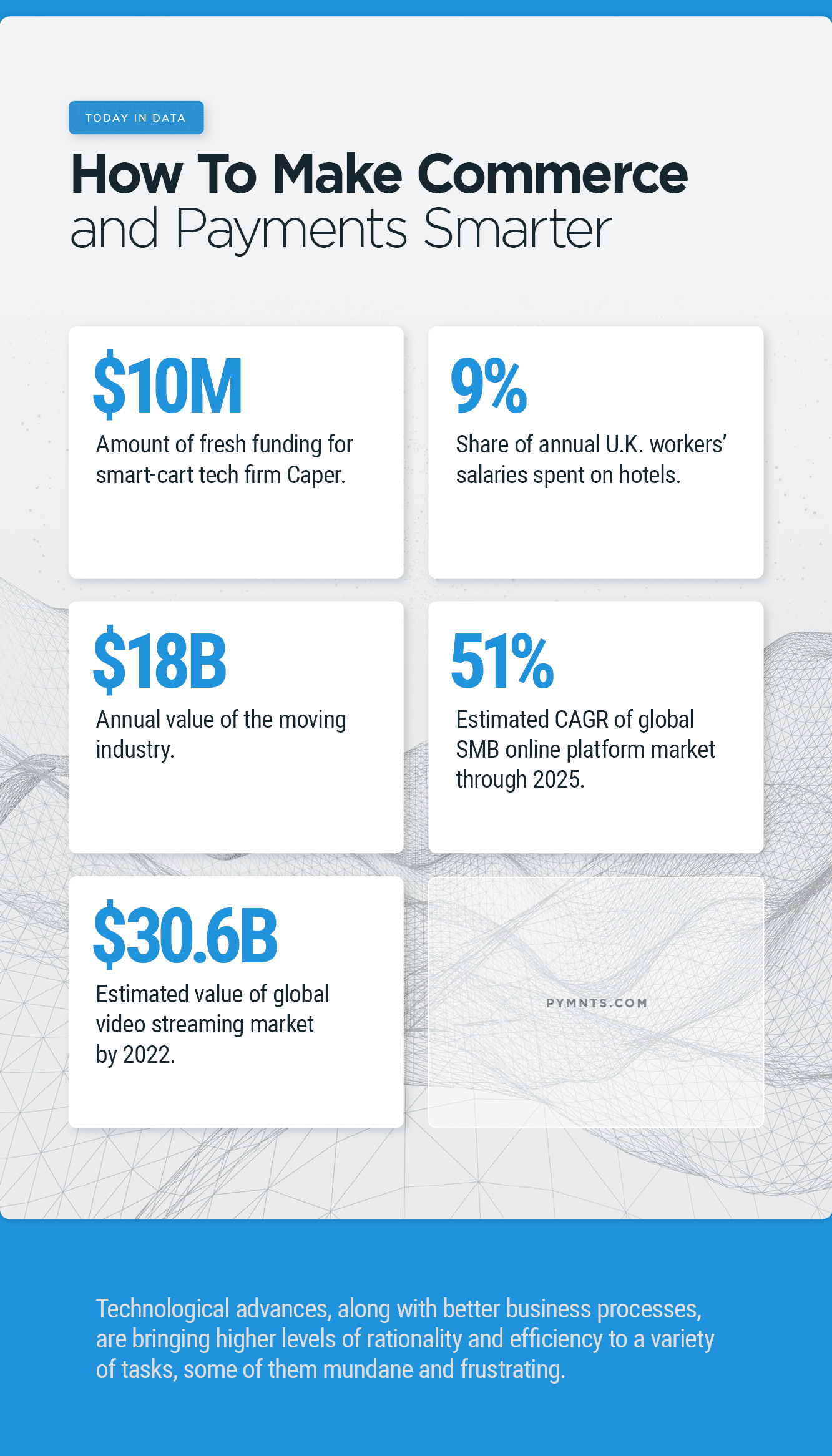 Grocery shopping is getting much, much smarter as the pace of innovation heats up. So are mundane, often frustrating tasks, such as moving. Meanwhile, better spend management is doing wonders in other parts of the economy, B2B is getting more integrated and fraud prevention is getting more robust.