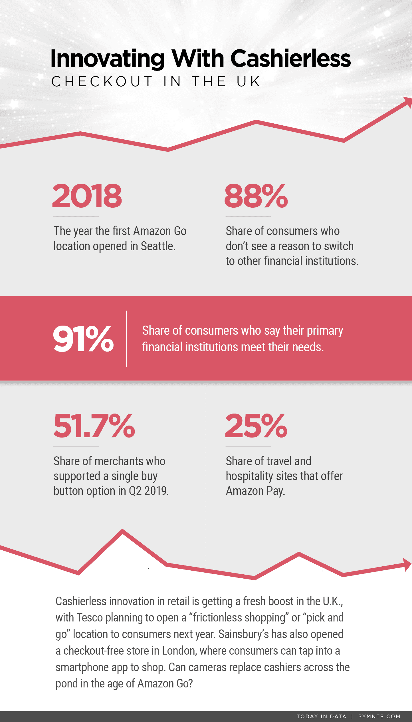 Tesco, among other British grocers, is working to bring cashierless shopping to the public in the age of Amazon Go. In other retail news, buy buttons have become so ubiquitous on eCommerce sites that the average shopper might not even notice them. And in consumer finance news, banks and credit unions benefit from the fact that most people like their banks, as these institutions fend off challenges from upstarts. All this, Today In Data.