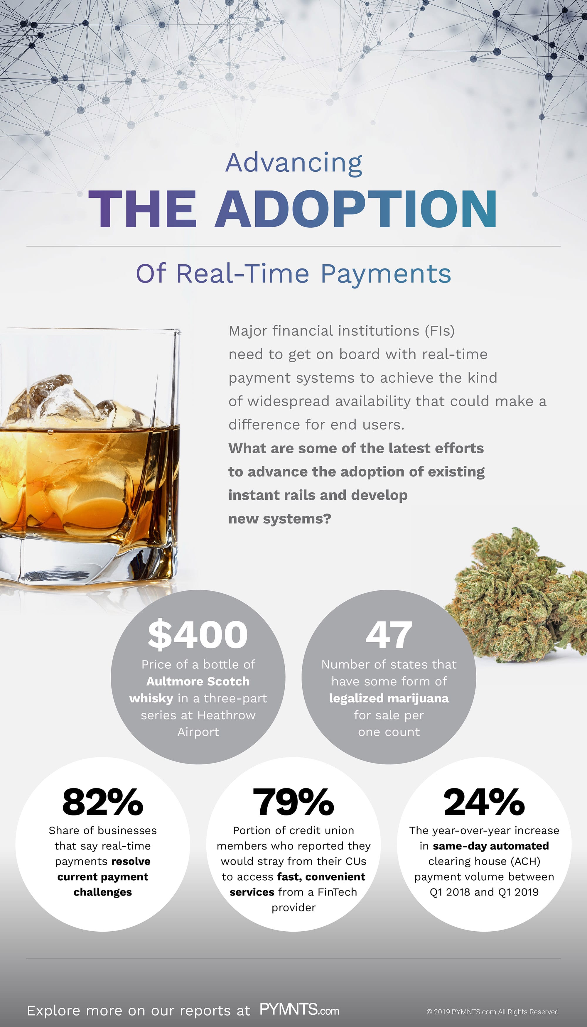 Major financial institutions (FIs) need to get on board with real-time payment systems for them to achieve widespread availability, while credit unions are finding friendly ground with FinTech firms. In retail, a closed-loop payments effort for legal marijuana is underway in Nevada, and airports are providing luxury brands with an audience of consumers looking for products they can’t buy at home. All this, Today In Data.