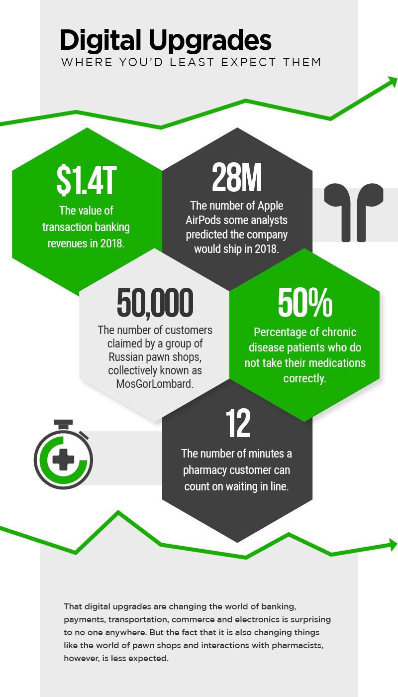 There are places where one would expect that technological innovations would play a big part in making things run better: banking, finance, payments and wearables are all favored topics here at PYMNTS. But the march of innovation goes off the well-worn path as well. Pawn shops may seem a tech proof-industry, but in Russia they’re adding blockchain to the mix. And while making patients’ medication compliant might seem an educational issue, a lot of progress in that arena can be made with technical pharmacy upgrades.