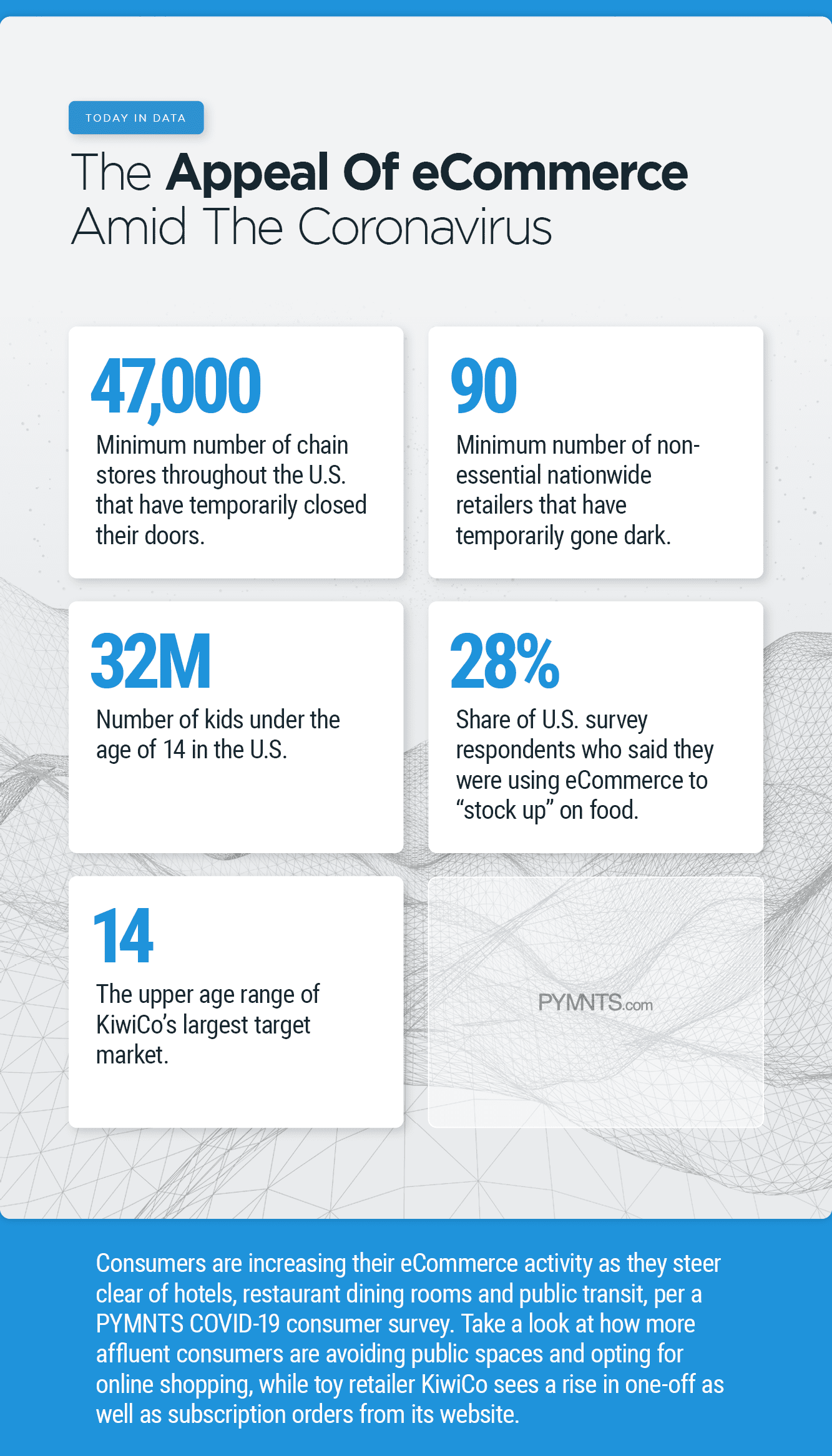 Consumers have stepped up their activity in eCommerce, as they are not staying in hotels, eating in restaurant dining rooms or using public transit, per a PYMNTS COVID-19 consumer survey. More affluent consumers appear to be focused on avoiding public spaces and making purchases through the web instead. And in toy retail, KiwiCo has seen a rise in orders for eCommerce subscriptions and one-off products at a time when children are home from school because of the coronavirus crisis. All this, Today in Data.