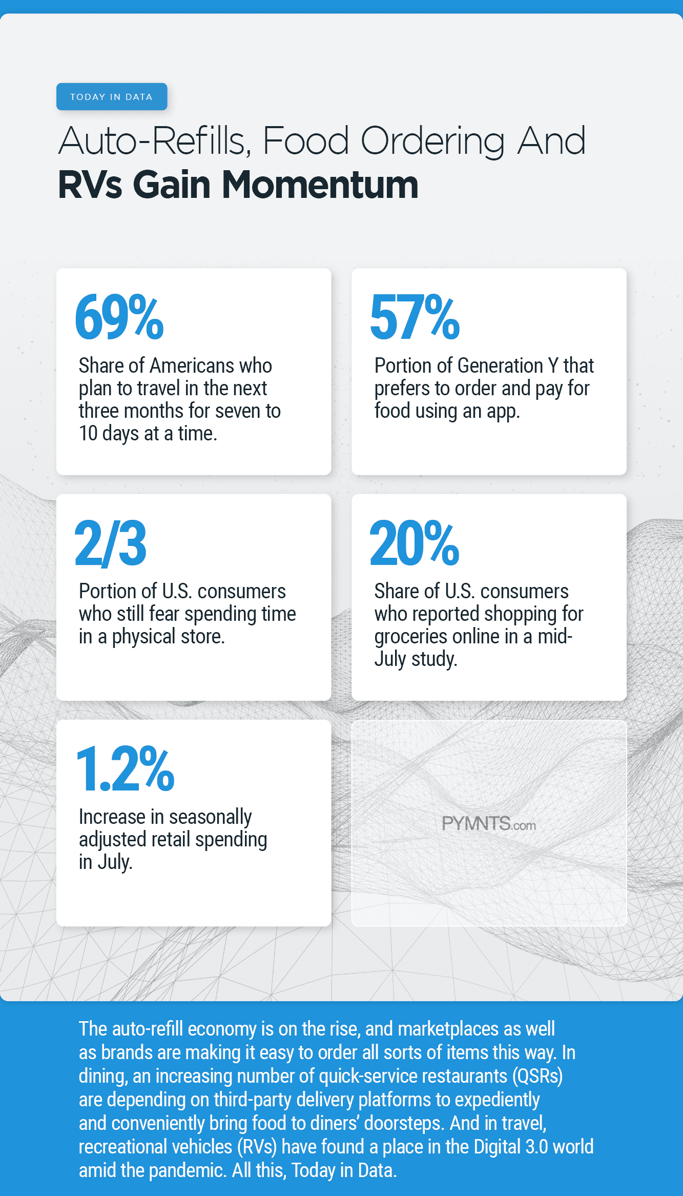 The auto-refill economy is on the rise, and marketplaces as well as brands are making it easy to order all sorts of items this way. In dining, an increasing number of quick-service restaurants (QSRs) are depending on third-party delivery platforms to expediently and conveniently bring food to diners’ doorsteps. And in travel, recreational vehicles (RVs) have found a place in the Digital 3.0 world amid the pandemic. All this, Today in Data.