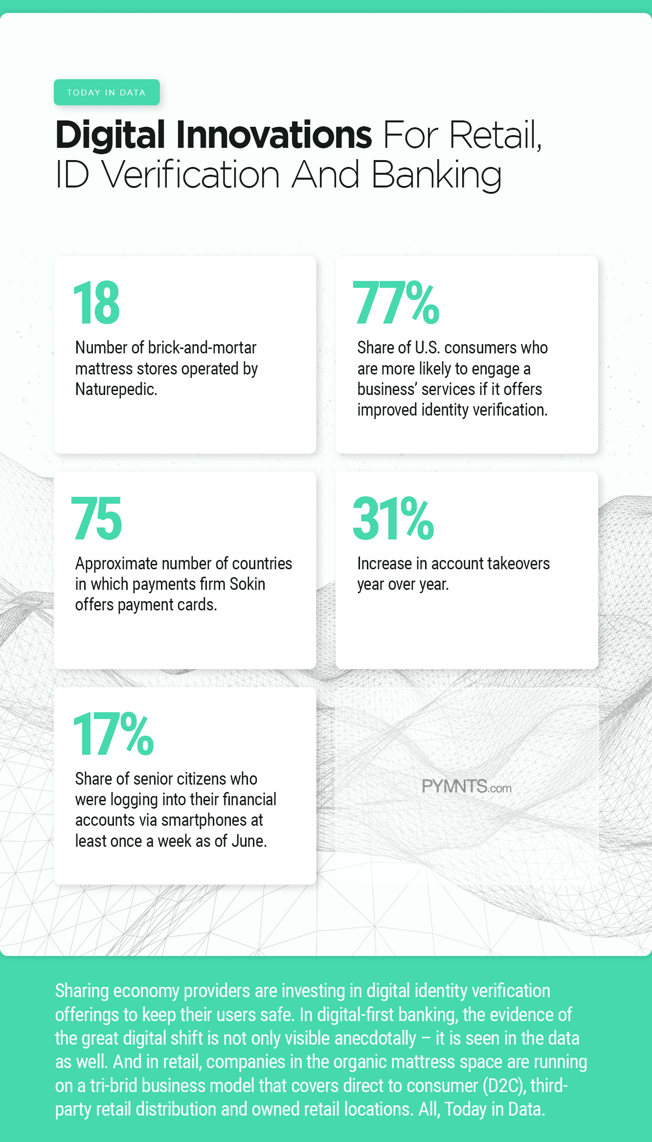 Sharing economy providers are investing in digital identity verification offerings to keep their users safe. In digital-first banking, the evidence of the great digital shift is not only visible anecdotally – it is seen in the data as well. And in retail, companies in the organic mattress space are running on a tri-brid business model that covers direct to consumer (D2C), third-party retail distribution and owned retail locations. All, Today in Data.