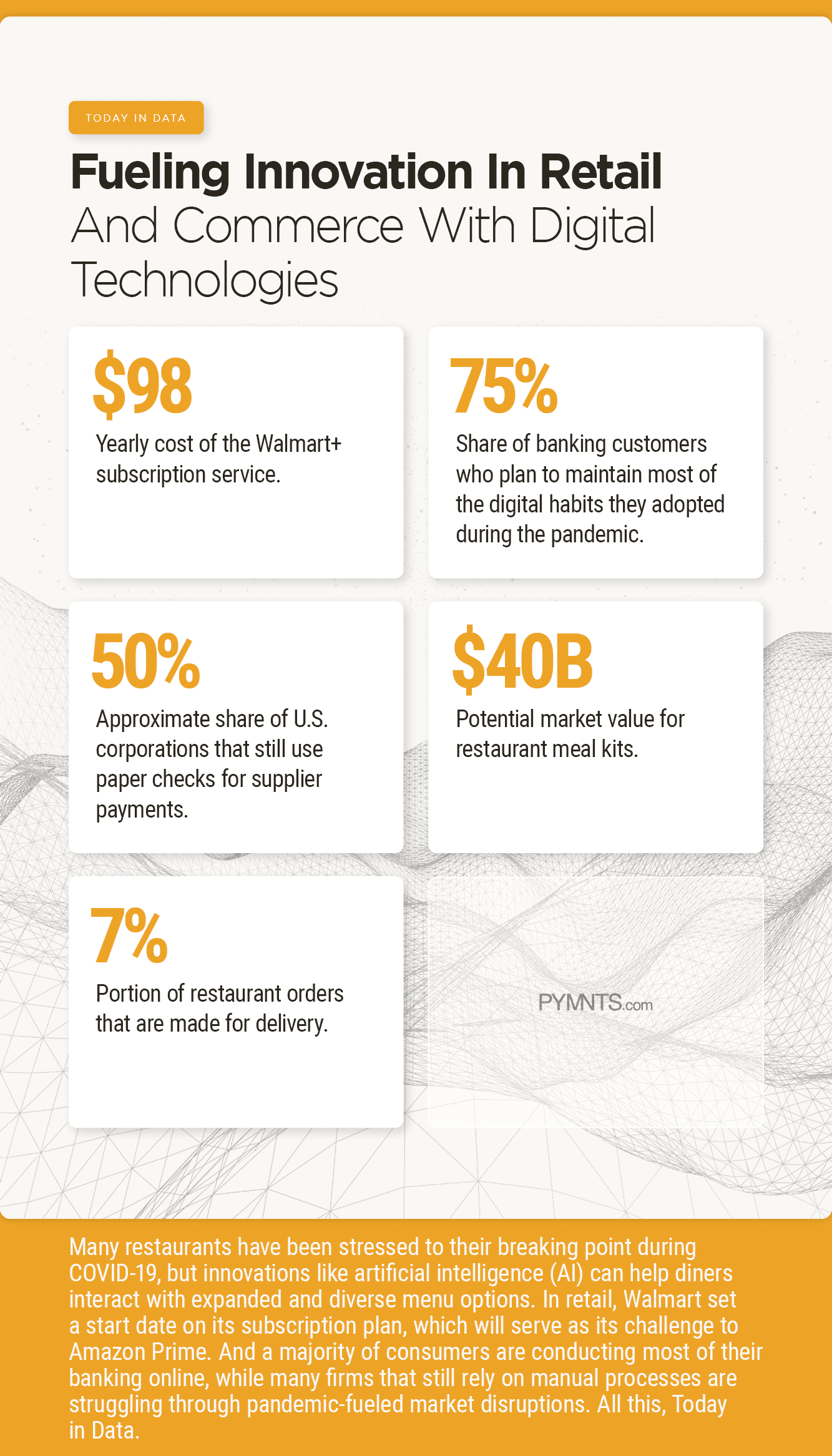 Many restaurants have been stressed to their breaking point during COVID-19, but innovations like artificial intelligence (AI) can help diners interact with expanded and diverse menu options. In retail, Walmart set a start date on its subscription plan, which will serve as its challenge to Amazon Prime. And a majority of consumers are conducting most of their banking online, while many firms that still rely on manual processes are struggling through pandemic-fueled market disruptions. All this, Today in Data.