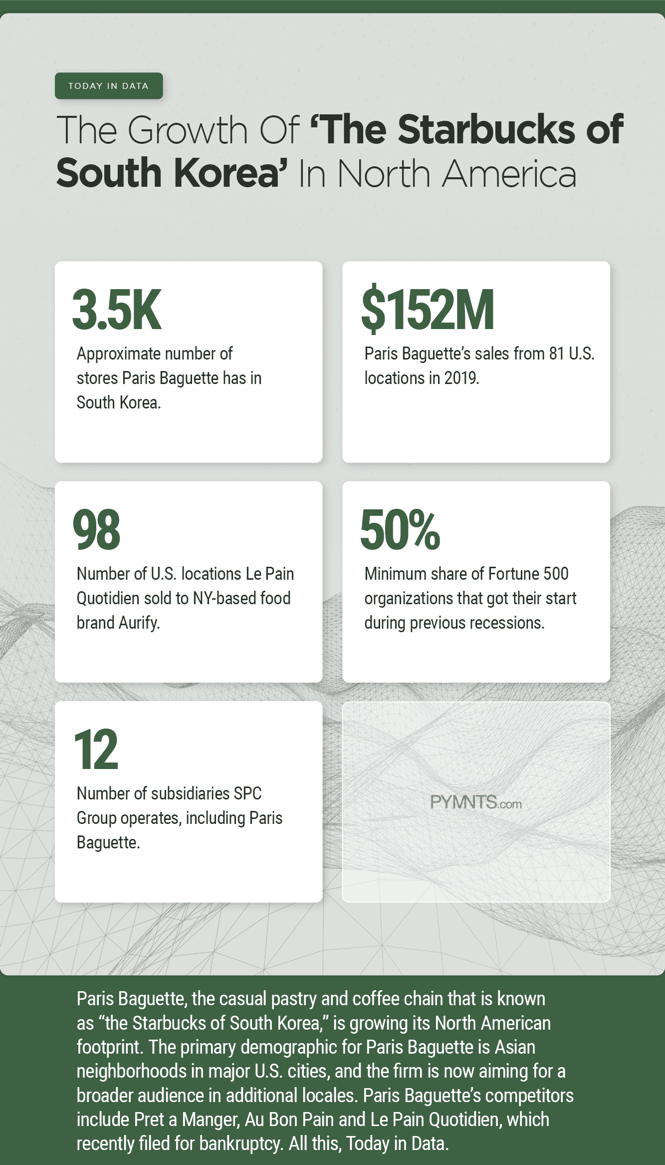 Paris Baguette, the casual pastry and coffee chain that is known as “the Starbucks of South Korea,” is growing its North American footprint. The primary demographic for Paris Baguette is Asian neighborhoods in major U.S. cities, and the firm is now aiming for a broader audience in additional locales. Paris Baguette’s competitors include Pret a Manger, Au Bon Pain and Le Pain Quotidien, which recently filed for bankruptcy. All this, Today in Data.