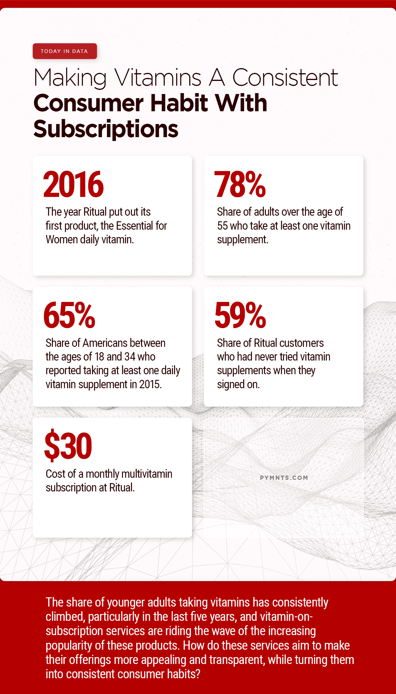 The share of younger adults taking vitamins has consistently climbed, especially in the last five years. Ritual, a vitamin-on-subscription service, is riding the wave of the increasing popularity of vitamin products for younger, more connected consumers. Aside from making its offering transparent and appealing, the company’s goal is to build its product into a consistent consumer habit. All this, Today in Data.