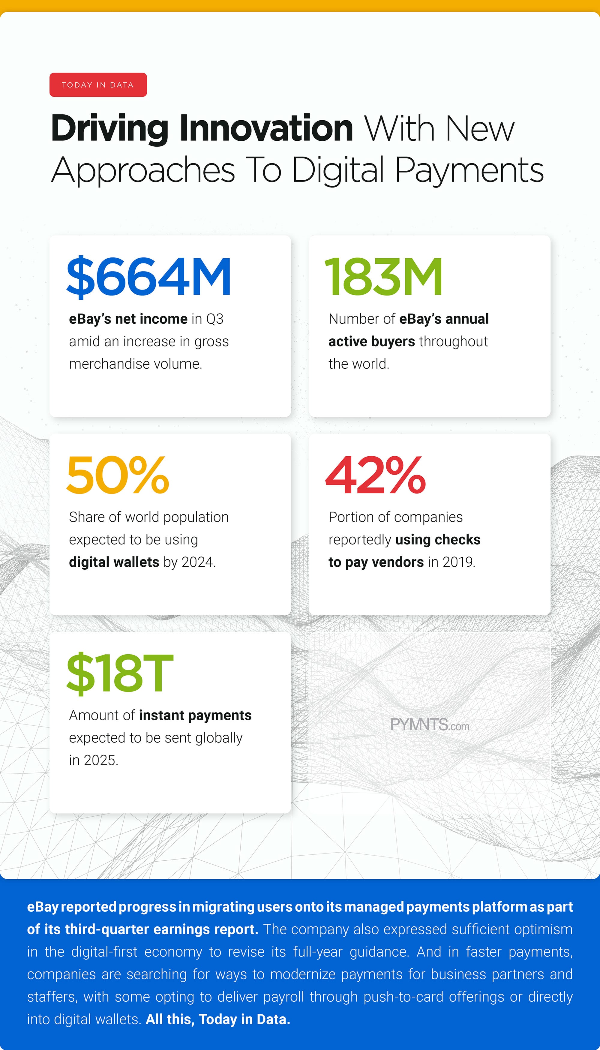 eBay reported progress in migrating users onto its managed payments platform as part of its third-quarter earnings report. The company also expressed sufficient optimism in the digital-first economy to revise its full-year guidance. And in faster payments, companies are searching for ways to modernize payments for business partners and staffers, with some opting to deliver payroll through push-to-card offerings or directly into digital wallets. All this, Today in Data.