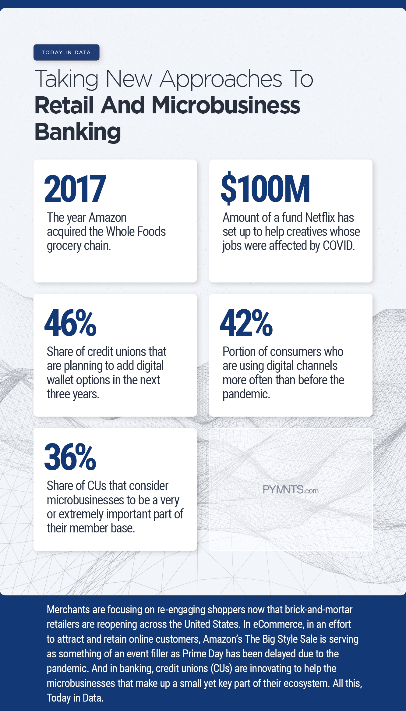 Merchants are focusing on re-engaging shoppers now that brick-and-mortar retailers are reopening across the United States. In eCommerce, in an effort to attract and retain online customers, Amazon’s The Big Style Sale is serving as something of an event filler as Prime Day has been delayed due to the pandemic. And in banking, credit unions (CUs) are innovating to help the microbusinesses that make up a small yet key part of their ecosystem. All this, Today in Data.