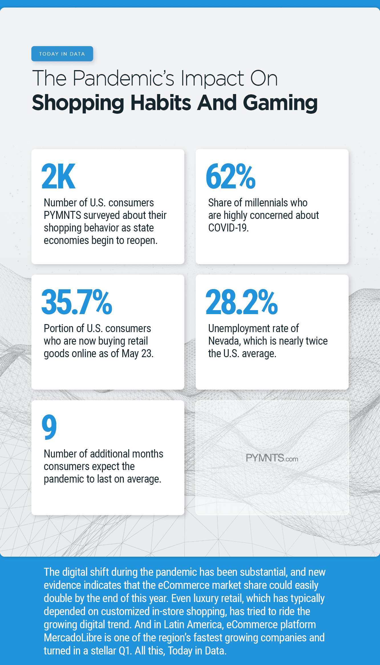 Most consumers don’t have any plans of reverting to their pre-pandemic shopping habits, even as portions of the U.S. economy continue to reopen. They are still shopping from their residences and are purchasing more online than they were prior to the start of the reopening. And in gaming, Las Vegas casinos shut their doors in mid-March due to the pandemic, which sent Nevada’s unemployment rate to almost twice the U.S. average. All this, Today in Data.