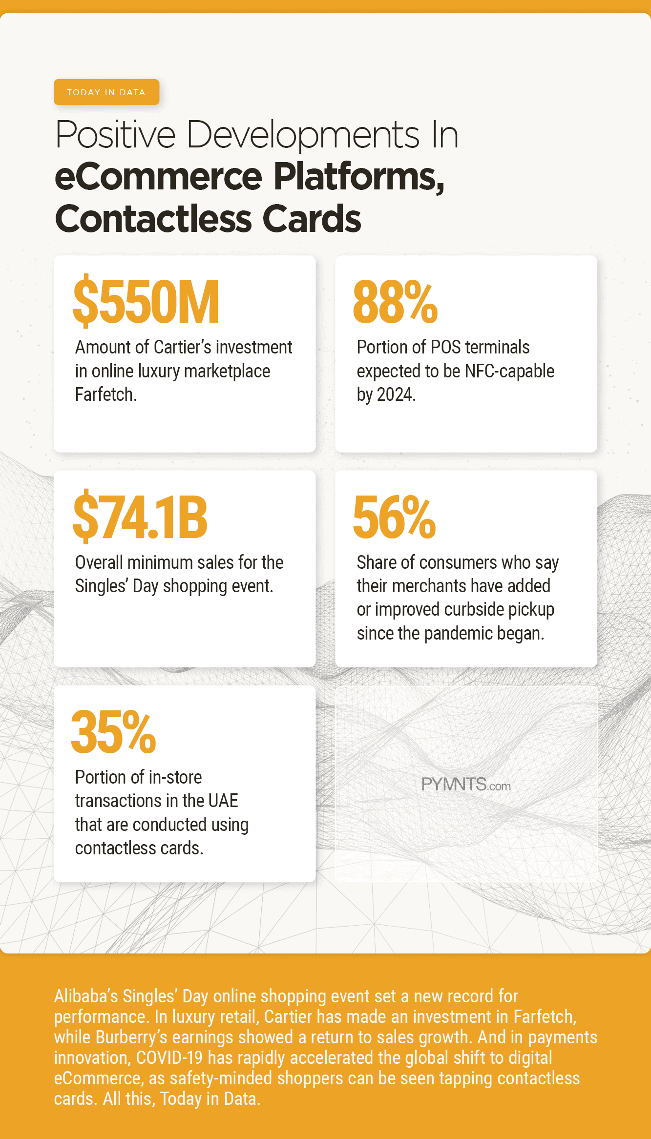 Alibaba’s Singles’ Day online shopping event set a new record for performance. In luxury retail, Cartier has made an investment in Farfetch, while Burberry’s earnings showed a return to sales growth. And in payments innovation, COVID-19 has rapidly accelerated the global shift to digital eCommerce, as safety-minded shoppers can be seen tapping contactless cards. All this, Today in Data.