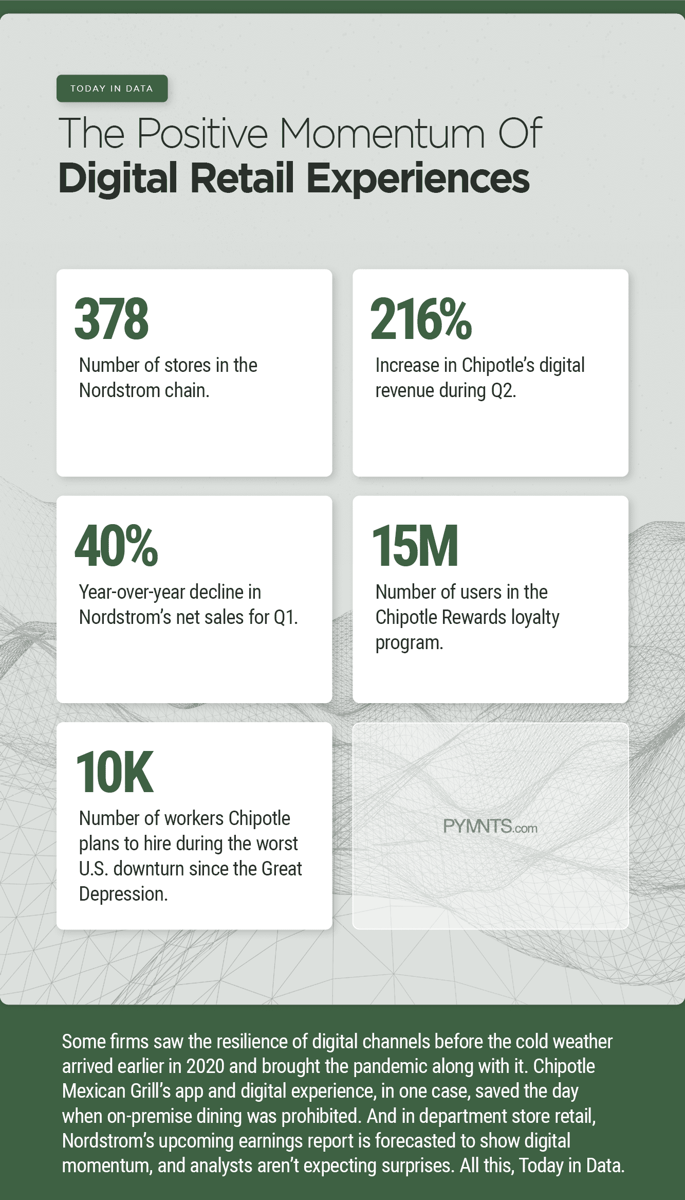 Some firms saw the resilience of digital channels before the cold weather arrived earlier in 2020 and brought the pandemic along with it. Chipotle Mexican Grill’s app and digital experience, in one case, saved the day when on-premise dining was prohibited. And in department store retail, Nordstrom’s upcoming earnings report is forecasted to show digital momentum, and analysts aren’t expecting surprises. All this, Today in Data.